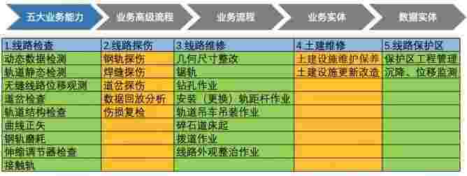 在轨道运维业务中,,,,,,,,,,,我们形成了完整的从业务能力(业务域)-业务流程-业务实体-数据模型的分析梳理过程。。。。。。。。。轨道运维业务能力如下图所示::::