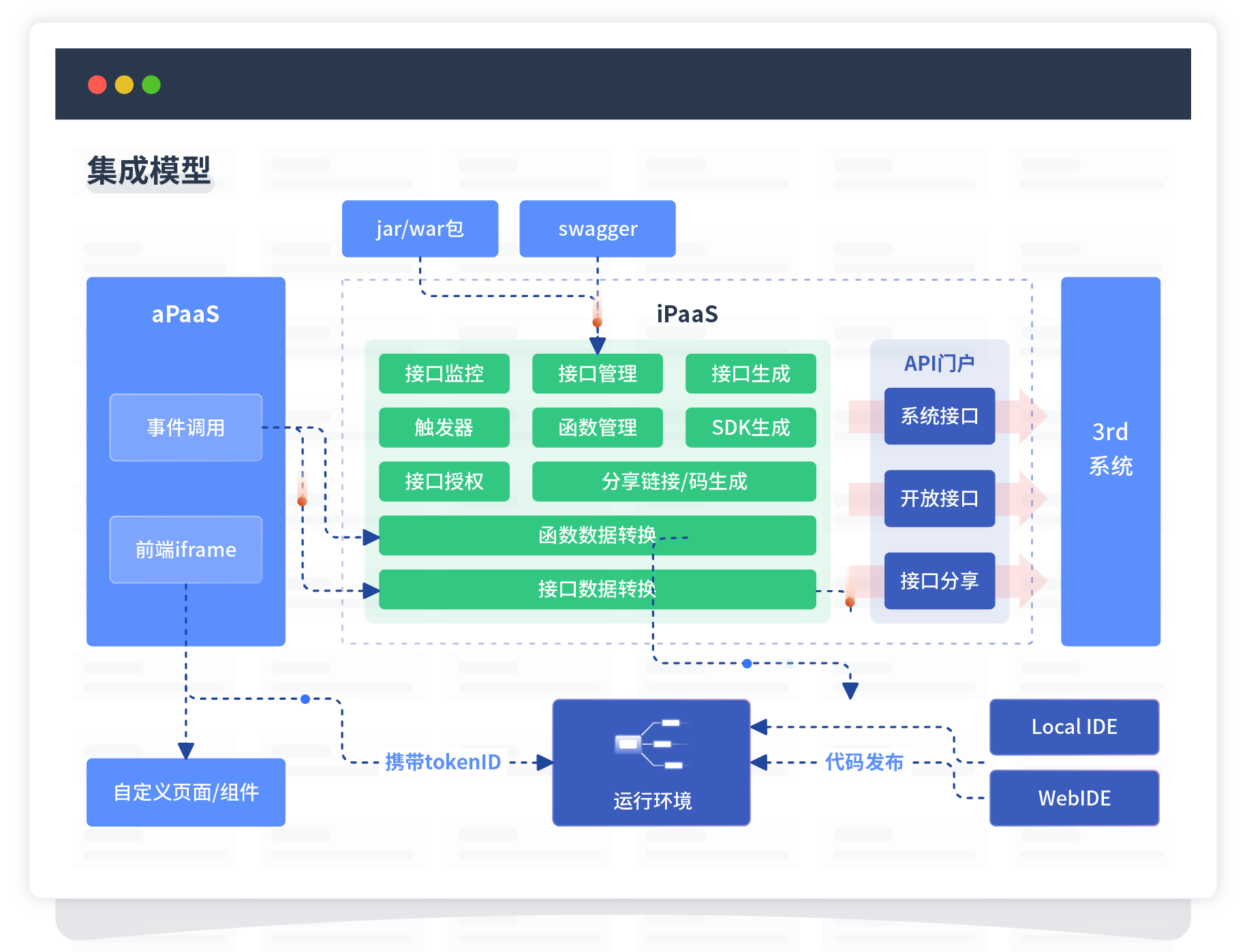 集成模型包括平台本身前、、、、、、、、、、、、后端能力的扩展,,,,,,,,,,,也支持通过API门户和第三方系统进行交互。。。。。。。。
