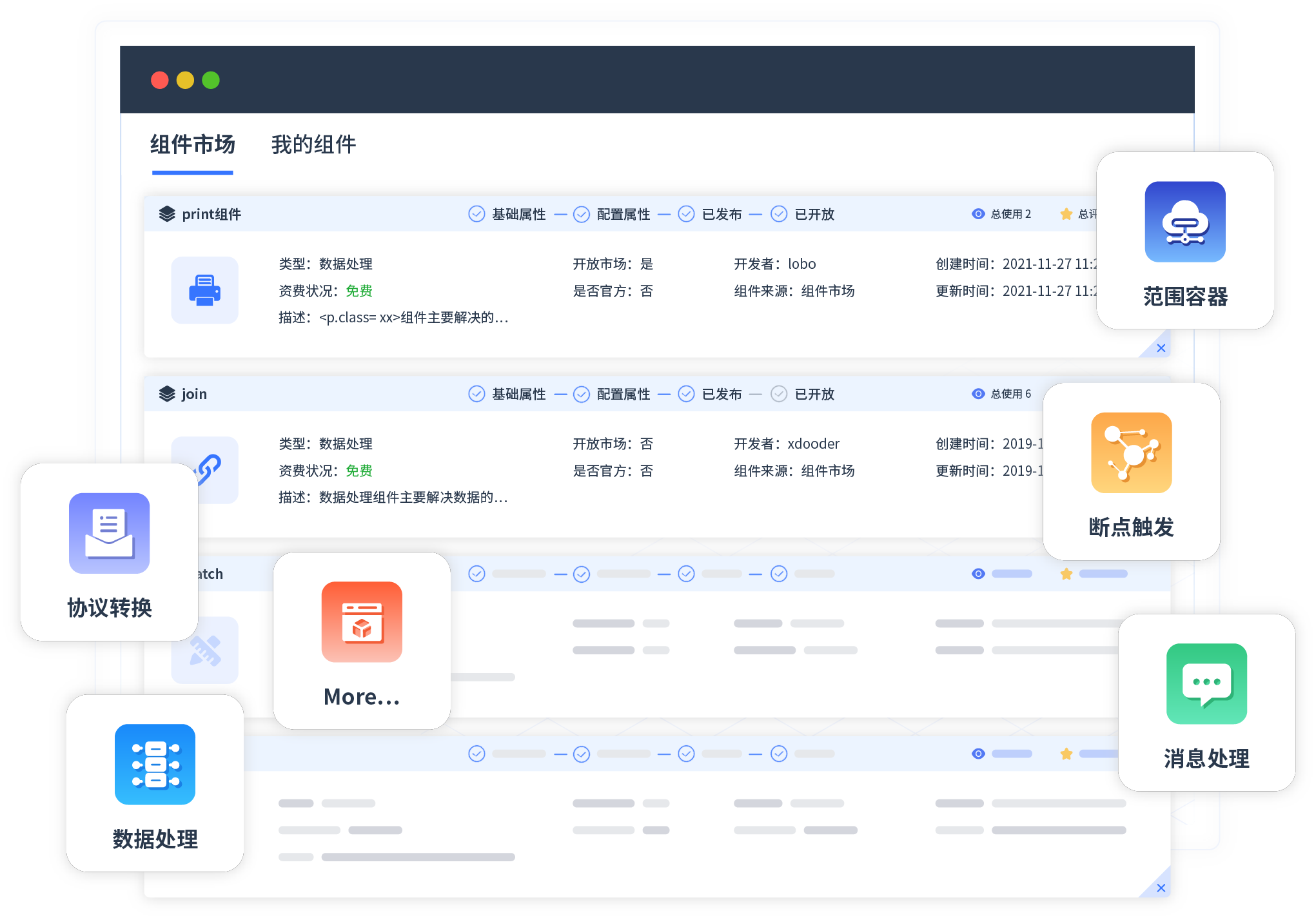 针对集成场景,,,,,,,,,NO钱包提供组件市场,,,,,,,,例如协议转换、、、、、消息处理、、、、文件操作等。。。。。除平台提供的组件外,,,,,,,,客户可以自定义所需组件。。。。。。。