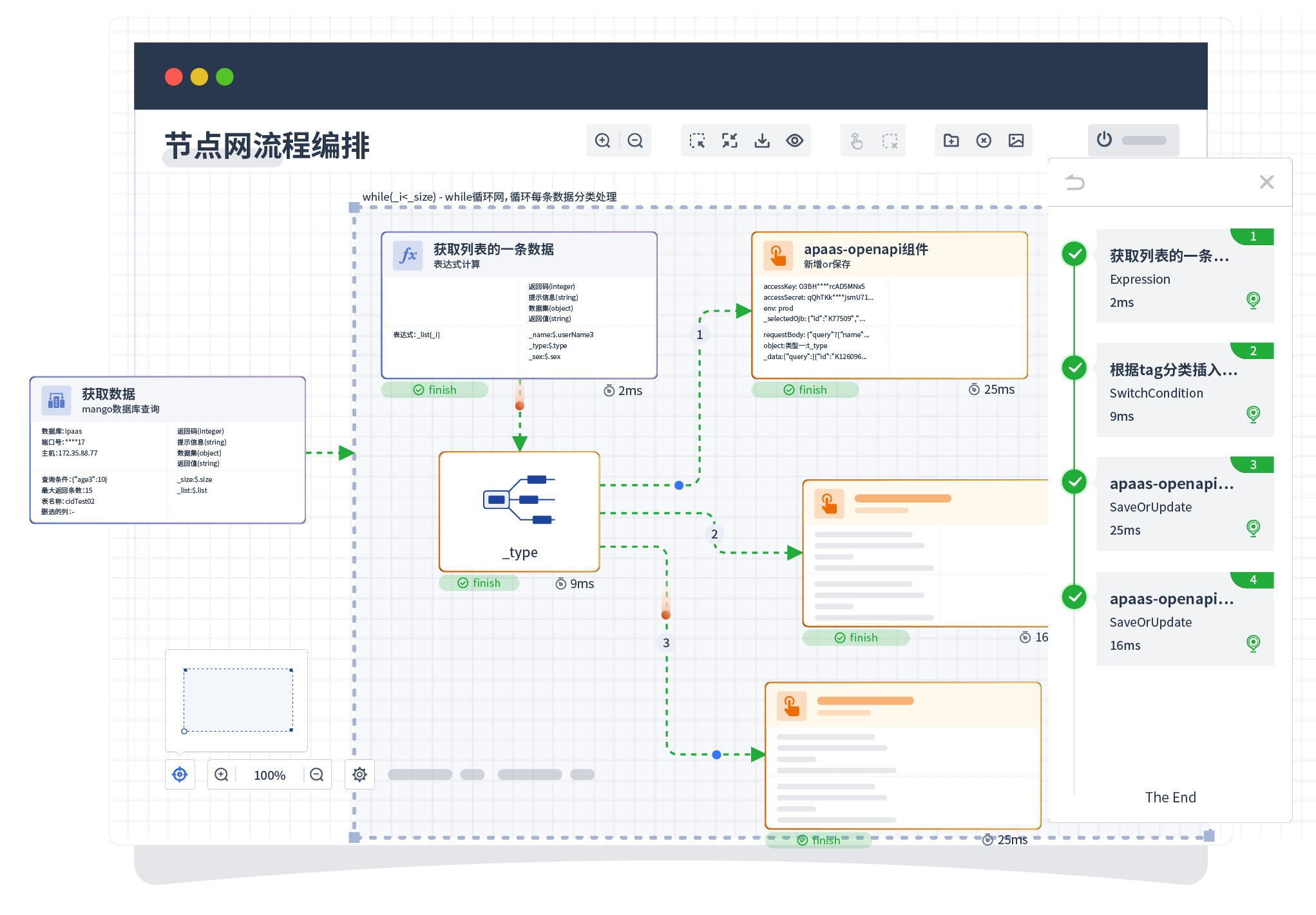 针对集成场景,,,,,,,,,,组件定义后支持进行流程编制,,,,,,,,,不同于传统代码方式,,,,,,,,通过图形化展示,,,,,,,,,,,,,,支持在线调试、、、、、日志查看和运行回放。。。。。